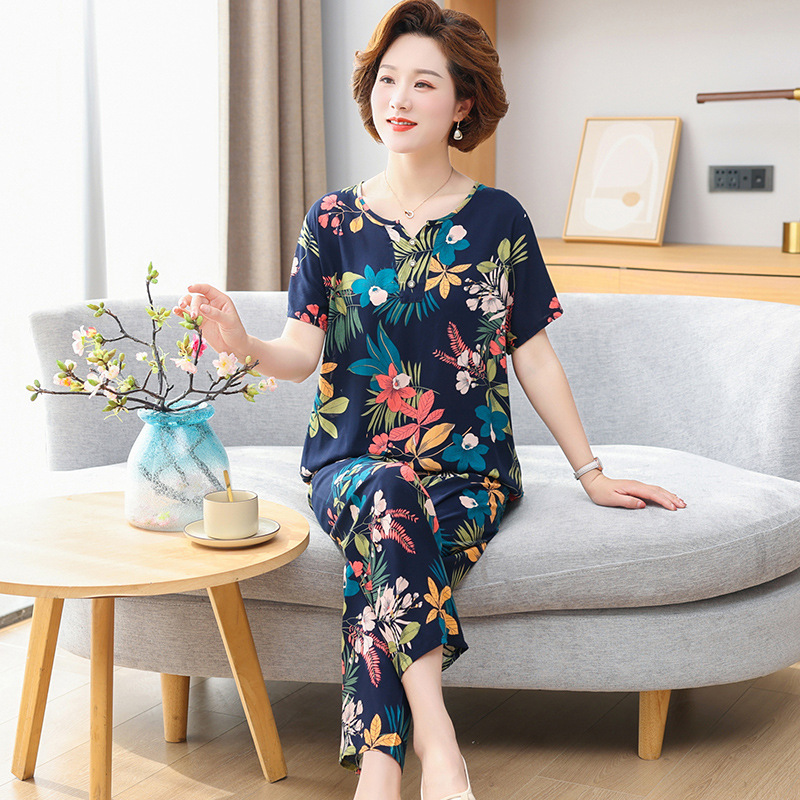 Setelan pakaian katun sutra wanita, celana panjang lengan pendek musim panas dua potong, pakaian rumah ibu dan lansia, pakaian luar ruangan