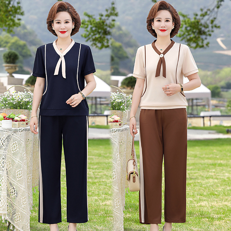 Pakaian Ibu Setelan Lengan Pendek Setengah Baya dan Tua Model Baru Musim Panas Atasan Membentuk Pinggang Setelan 100 Pagoda Kasual Modis