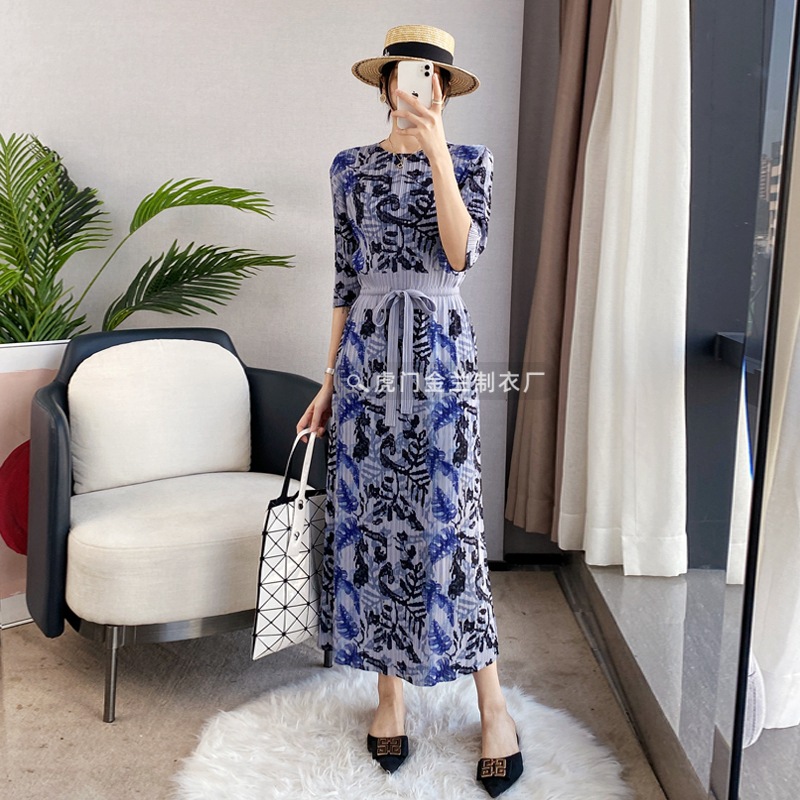 Sanzhai gaun lipit wanita, gaun bercetak vintage leher bulat lengan pendek, tali pelangsing mengurangi usia ibu modis