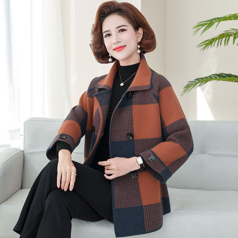 Pakaian musim gugur ibu paruh baya, mantel wol houndstooth gaya Barat pakaian wanita paruh baya dan lansia musim semi dan musim gugur musim dingin modis atasan