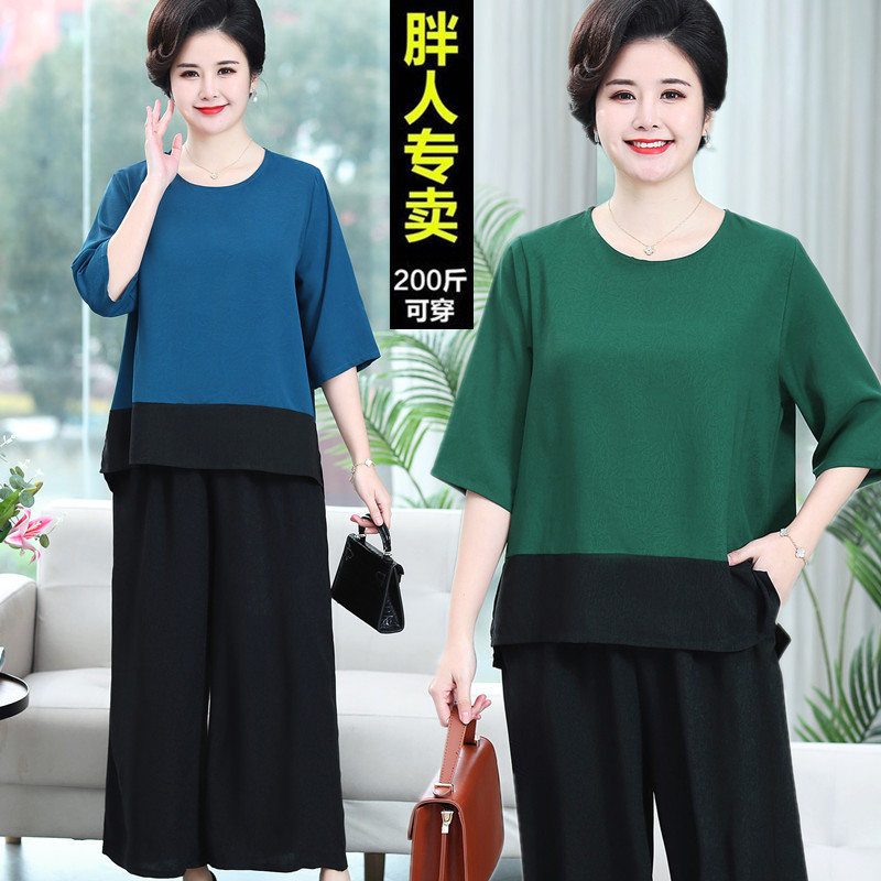 Setelan Ibu Ukuran Besar Pakaian Wanita Setengah Baya 40 Tahun 50 Musim Panas Kaos Lengan Pendek Celana Kaki Lebar 200Kg Setelan Dua Potong Gaya Barat