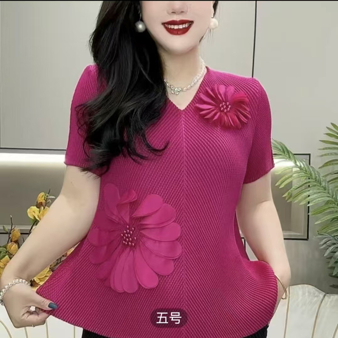 Atasan Elastis Tiga Dimensi Lipit Ibu Modis Model Baru Gaya Barat Bunga Lengan Pendek Longgar Musim Panas Kaos Dalaman Terlihat Langsing
