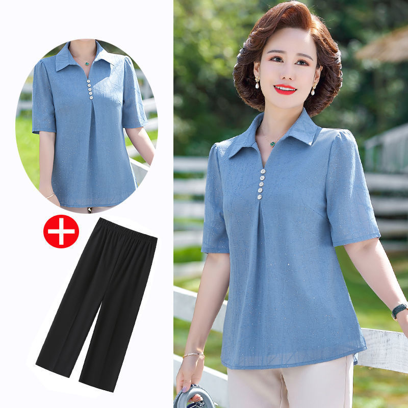 Kemeja Lengan Pendek Musim Panas Ibu Hari Ibu Ukuran Besar Longgar Pakaian Wanita Setengah Baya dan Usia Lanjut Kemeja Sifon Musim Panas Set Dua Potong
