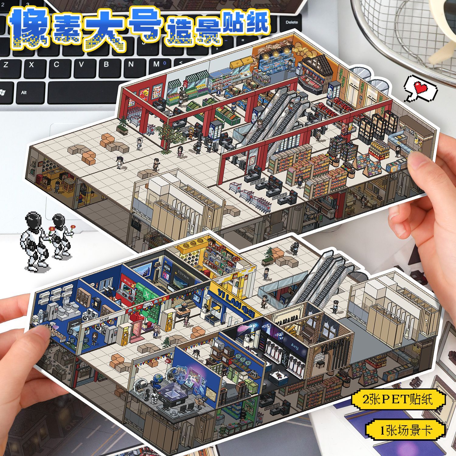 47.0 Seni Stiker Lansekap Gaya Pixel Biru Besar Stiker 3D Stiker Stereo 3D Stiker Gambar Tangan DIY untuk Kolase Adegan Miniatur