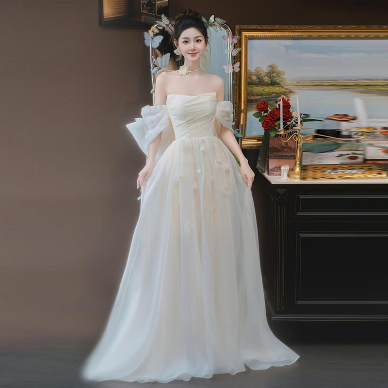 Gaun putih kecil satin Prancis, gaun pertunangan Super peri temperamen benang luar ruangan sederhana dengan pendaftaran sertifikat