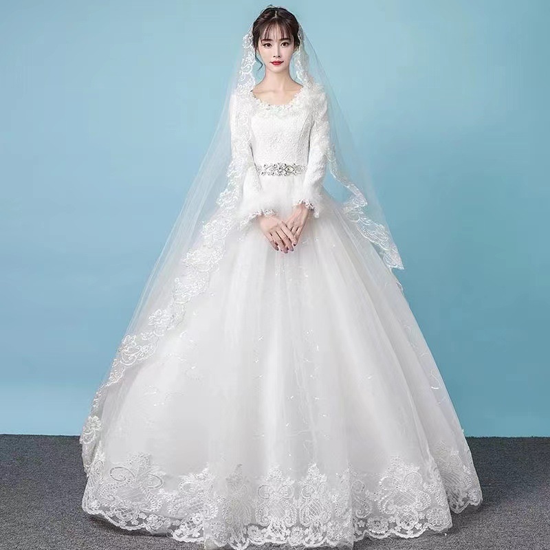 Gaun pernikahan cahaya utama Musim Panas 2024 baru pernikahan pengantin hangat putih lengan panjang tebal musim dingin gaya Mori lantai panjang Super peri