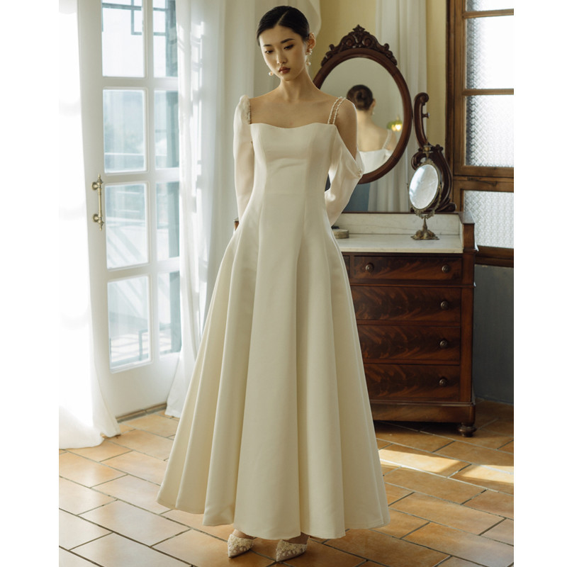 Gaun pengantin tali Satin, benang luar ruangan ringan fotografi perjalanan sederhana Prancis retro putih lengan panjang