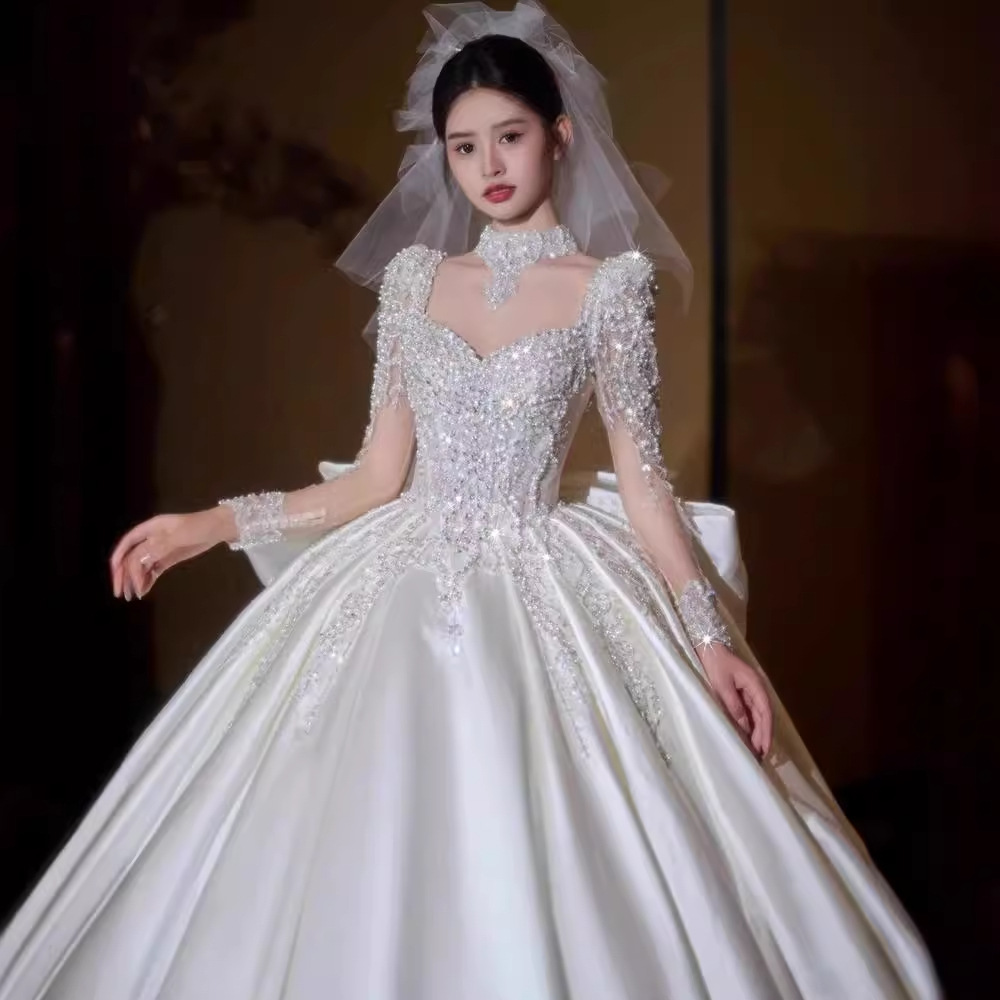 Gaun Pengantin Wanita Mewah Lengan Panjang Model Baru Perdagangan Luar Negeri Gaun Pengantin Utama Ekor Panjang Ekor Panjang Gaun Pengantin Gaun Slim-fit Terlihat Kurus