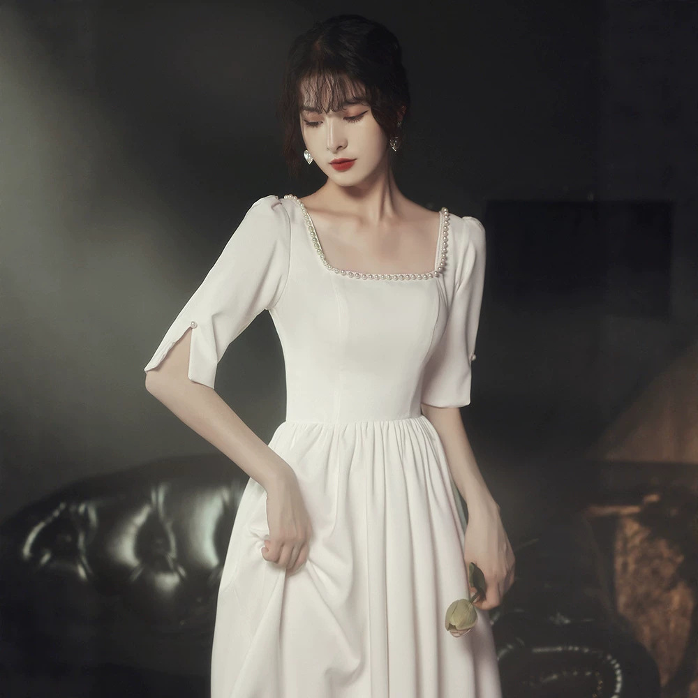 Gaun malam kecil wanita, gaun acara pernikahan elegan warna putih untuk tuan rumah, pertemuan tahunan, jamuan, pakaian pernikahan pada waktu biasa 2024