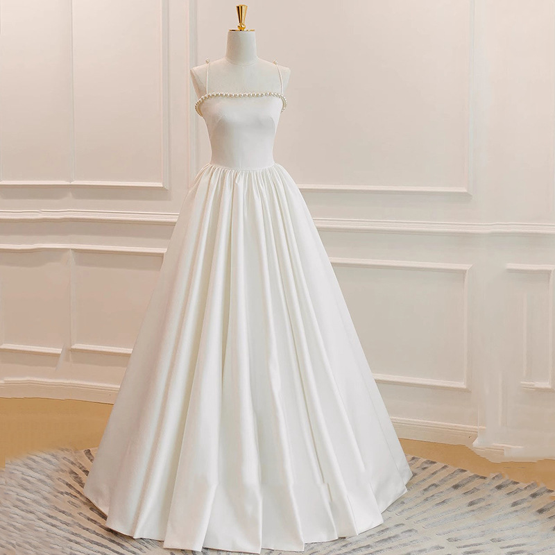 Gaun pernikahan tali Prancis 2024 baru satin sederhana retro mutiara anak perempuan gaun sepanjang lantai musim panas