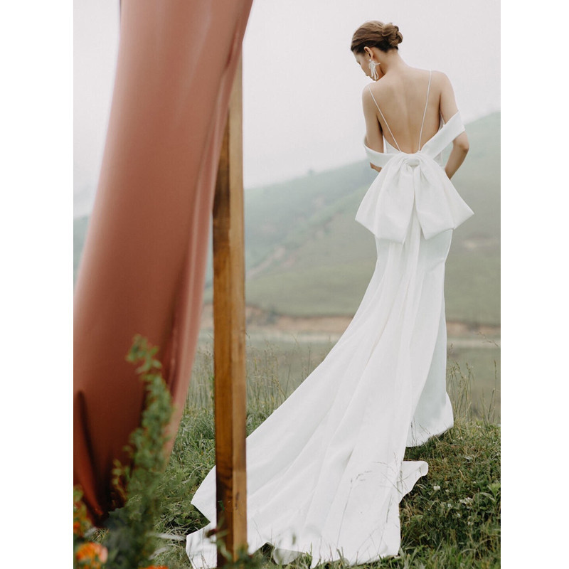 Gaun pernikahan ringan gaya Perancis 2024 gaun ekor ikan menembak perjalanan pengantin sederhana satin putih benang luar ruangan kecil gaya baru untuk wanita