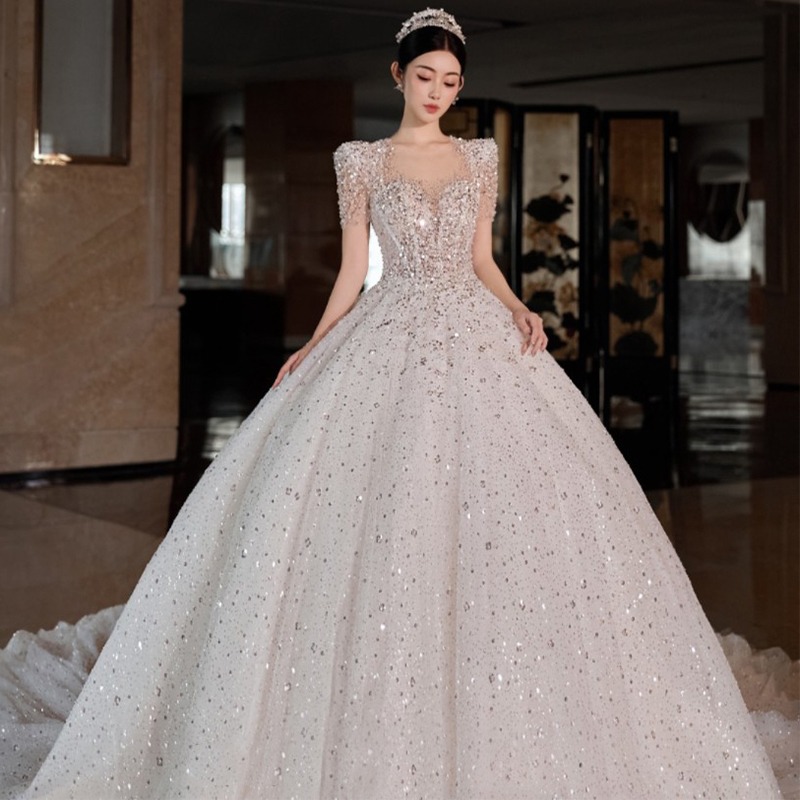 Gaun pernikahan putri gaya Perancis, ekor tekstur kualitas tinggi musim panas lengan pendek