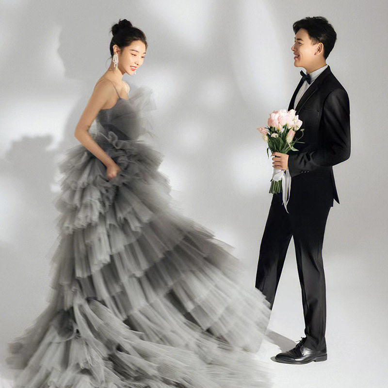 Gaun pengantin utama Sling studio pakaian fotografi bertema pasangan gaun pengantin elegan abu-abu Mori gaun panjang trailing