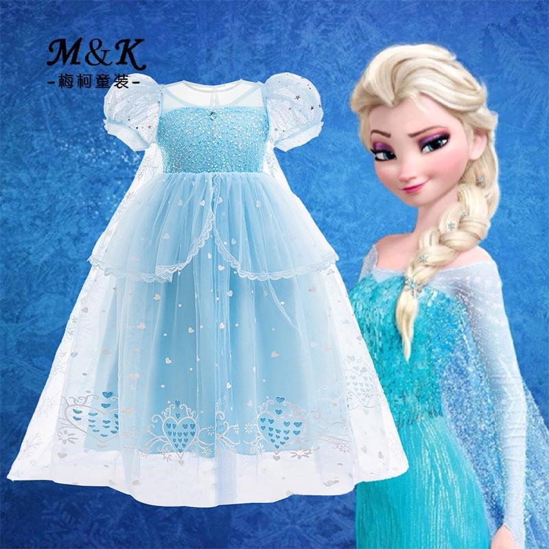 跨境夏季新款艾莎女童礼服泡泡袖公主裙婚纱演出服亮片连衣裙
