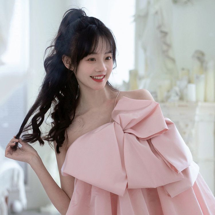 Gaun pengantin bertema studio, gaya baru kelas atas, fotografi perjalanan luar ruangan, pemotretan foto pasangan berwarna merah muda, gaun tanpa tali, foto seni, gaun kue