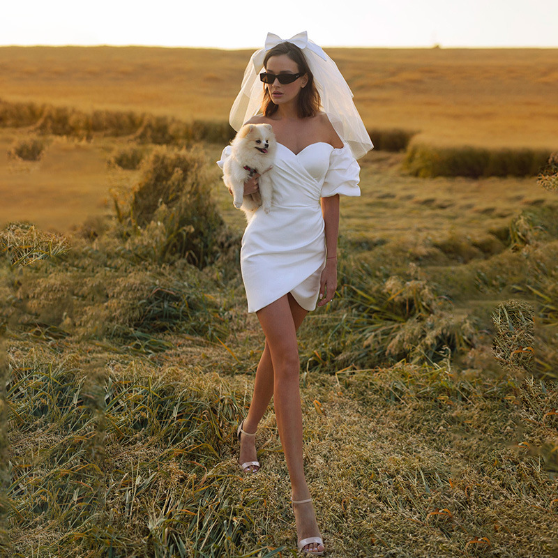 Gaun pernikahan gaya Perancis, gaun pengantin ringan dari bahu terbuka satin retro sederhana, gaun pertunangan putih pendek