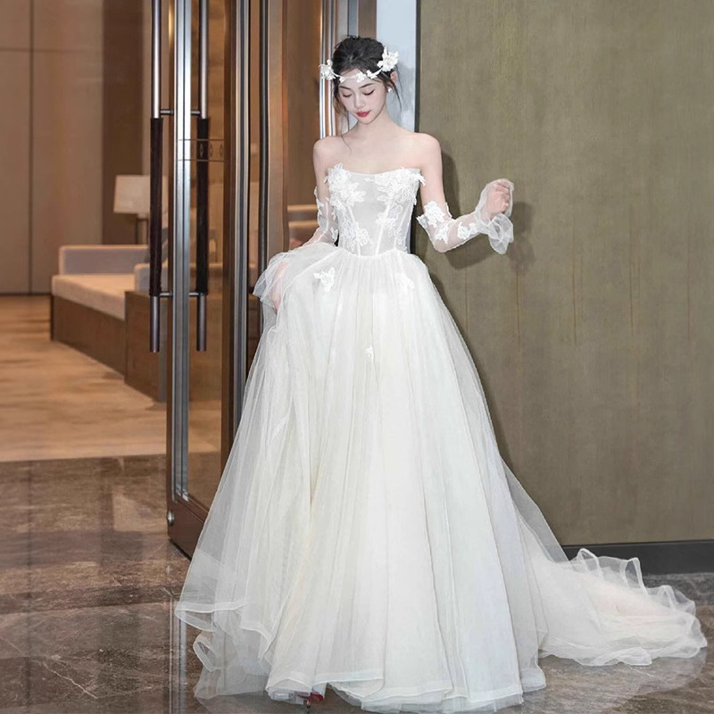Gaun pagi pernikahan China, baru fotografi perjalanan luar ruangan gaun liburan tepi pantai bahu terbuka gaun pernikahan ringan putri peri Super
