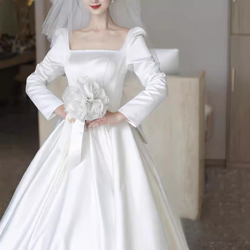 Gaun pengantin lengan panjang bergaya Mori model baru 2026, simpel elegan dengan ekor, bergaya Korea, bahan satin.