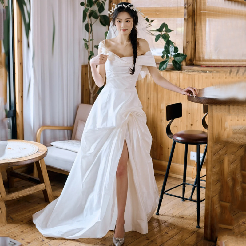 Gaun pernikahan gaya Prancis, cahaya bahu terbuka, gaun pengantin sederhana satin keluar, benang selamat datang, gaun belahan tinggi Super peri 2024