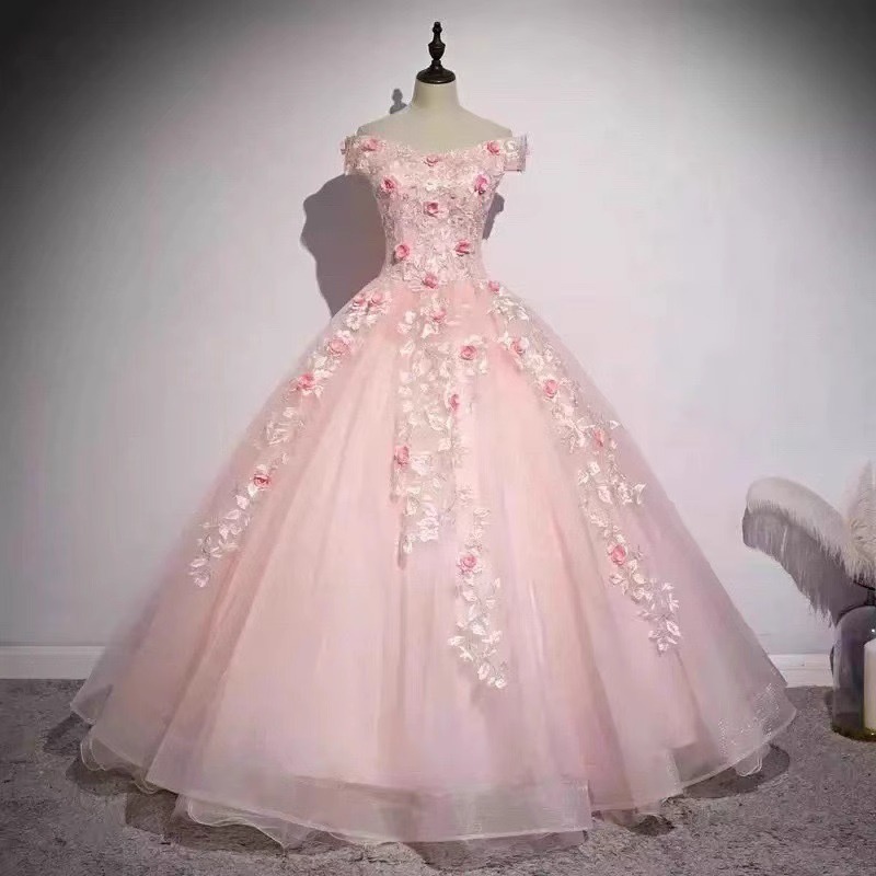 Gaun malam puffy bahu terbuka bunga merah muda gaun malam wanita ujian seni solo piano guzheng pertunangan pengantin roti