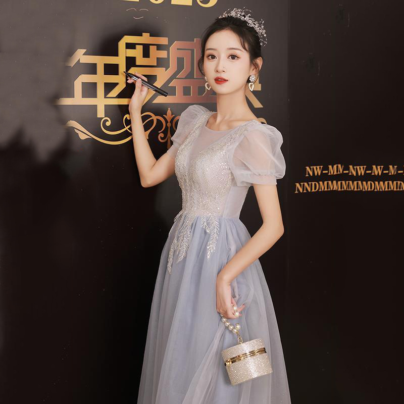 Gaun malam Prancis biru untuk wanita 2024, kostum temperamen panjang ujian seni musik vokal solo Kecantikan host baru