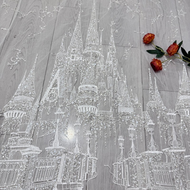 新款钉珠亮片刺绣城堡星星月亮蕾丝面料布料婚纱礼服童装背景装饰