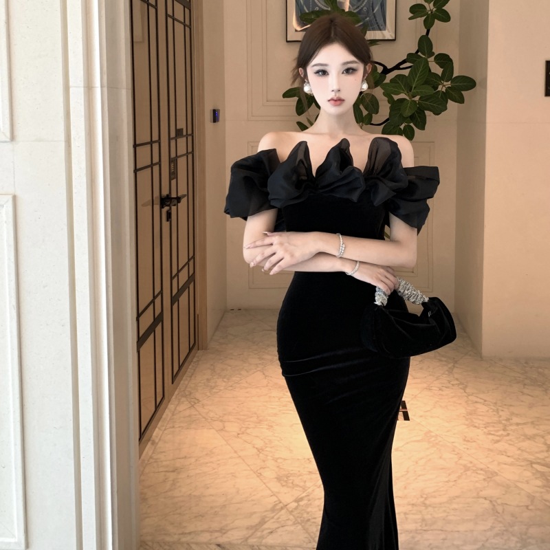 跨境一字领修身显瘦丝绒礼服连衣裙2025秋冬新款气质时尚女装长裙