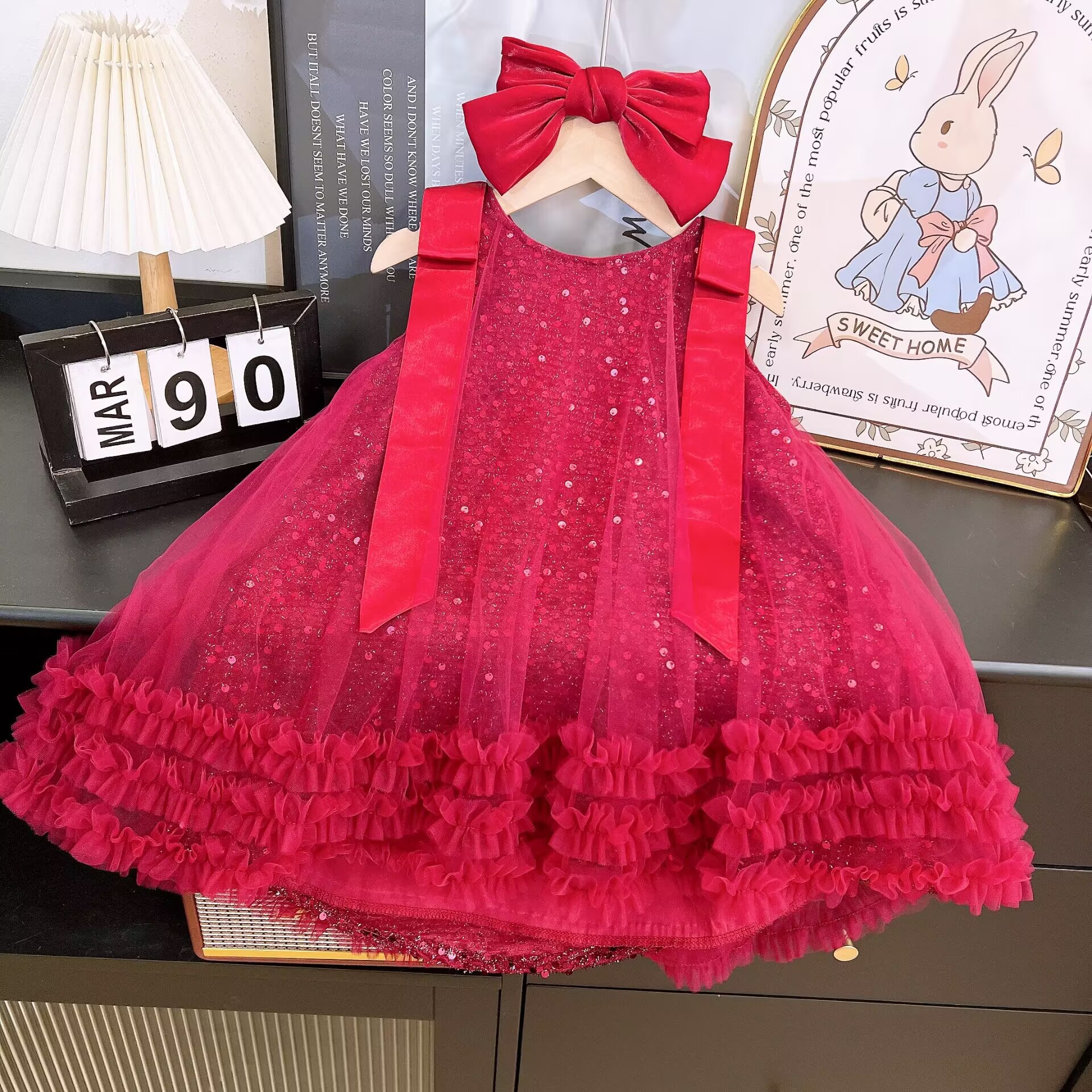 2025圣诞新女童红色亮片网纱裙新年无袖公主裙周岁礼服裙蛋糕裙