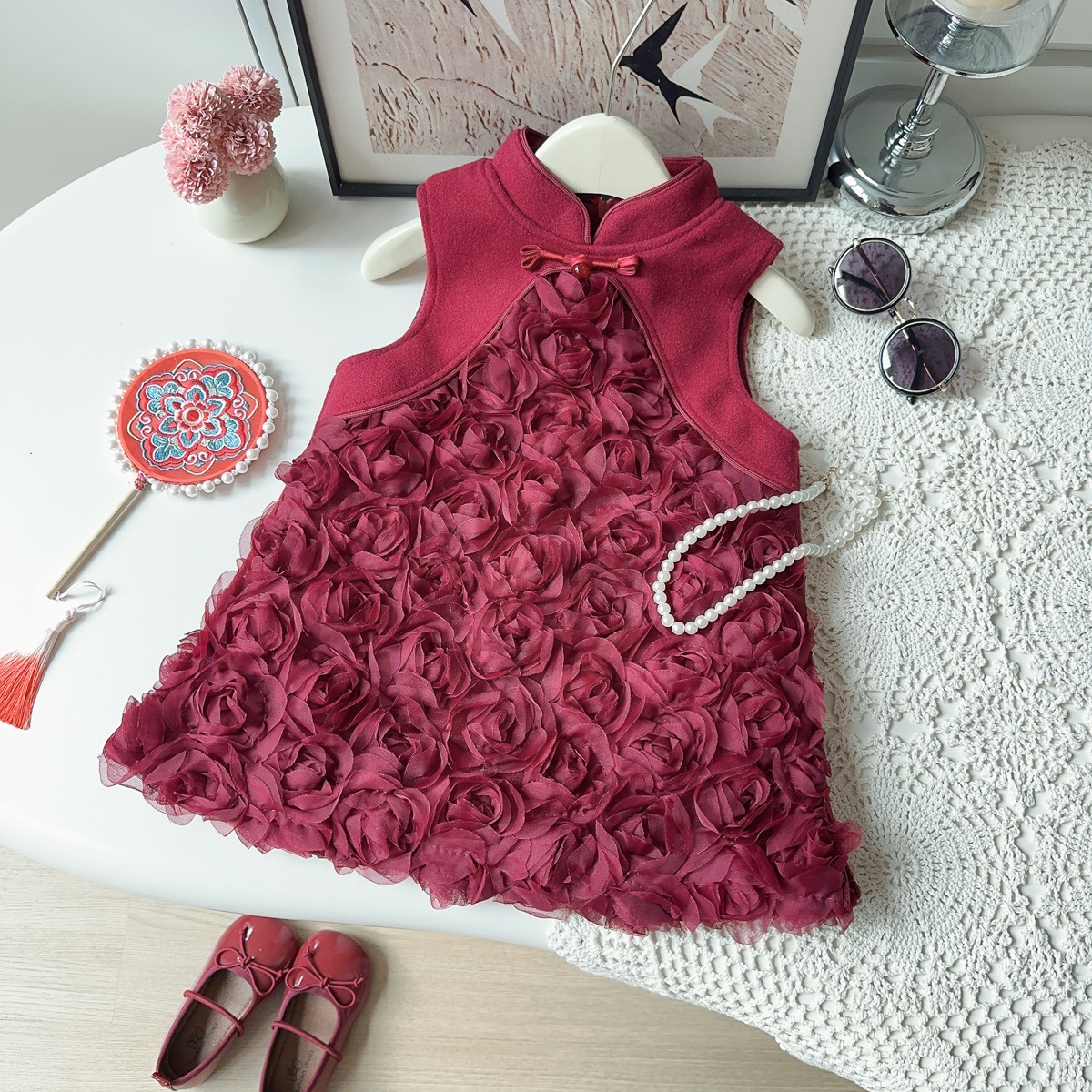 冬季女童背心连衣裙2025新款中国风花朵无袖旗袍裙汉服童裙代发