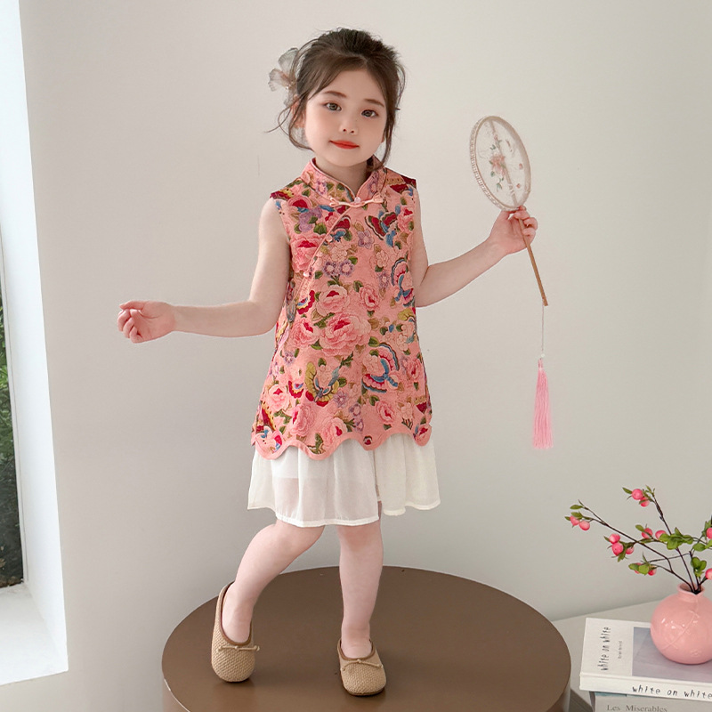 Gaun Gaya Tiongkok Baru Anak Perempuan Rok Cheongsam Anak-Anak Kecil dan Menengah Gaya Tiongkok Musim Panas Gadis Kecil Lucu Model Baru 2025