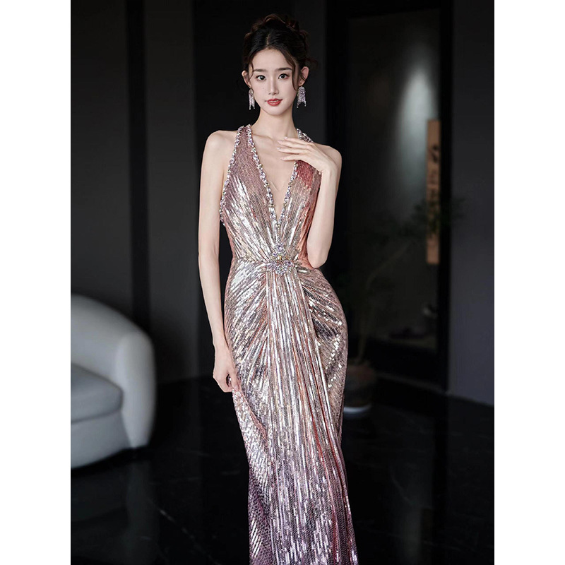 Gaun Malam Gantung Leher Gaun Pagi Ekor Ikan Payet Gaun Upacara Pertunangan Pengantin Wanita Pakaian Bersulang Kerah V Perjamuan Bergaya Tuan Rumah