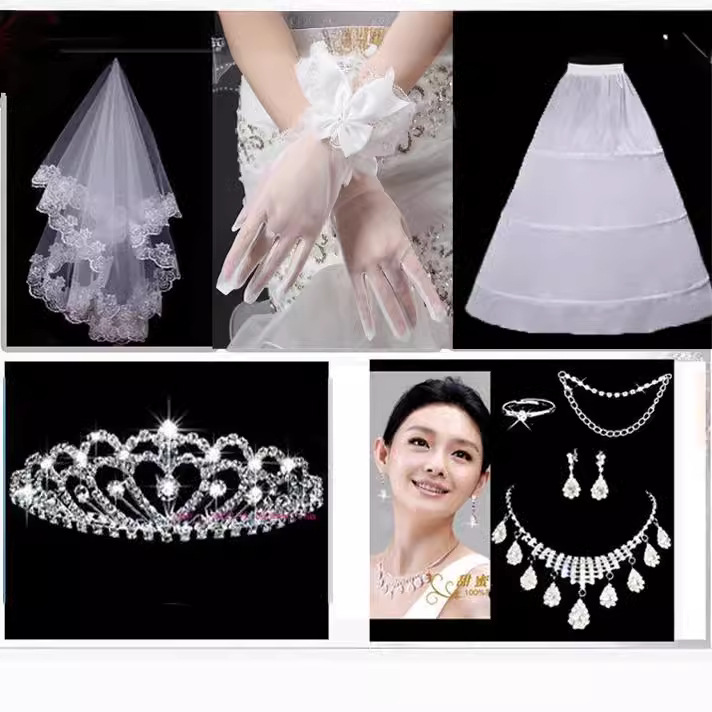 Grosir paket aksesori pernikahan rok kerudung sarung tangan pendukung mahkota kalung anting cincin gelang nilai delapan potong setelan