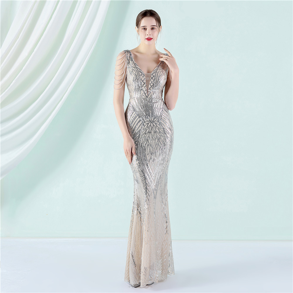 18906 # posisi manik-manik bunga kerajinan manik-manik perjamuan elegan panjang lengan pendek berpayet aura Ratu rok ekor ikan