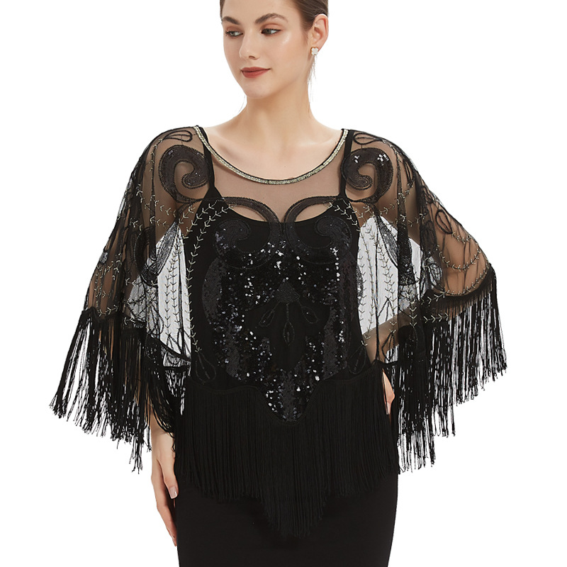 Pabrik grosir mesh payet gaun rumbai selendang wanita gaun pernikahan gaun suspender elegan blus manik-manik Cape