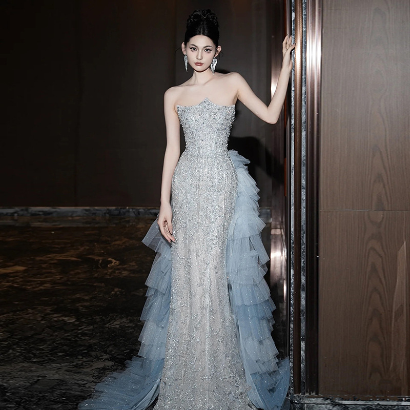 Gaun Malam Ratu Elegan Gaun Pesta Pesta Wanita Mewah Pesta Tahunan Wanita Pakaian Bersulang Pengantin Wanita Ekor Ikan Biru