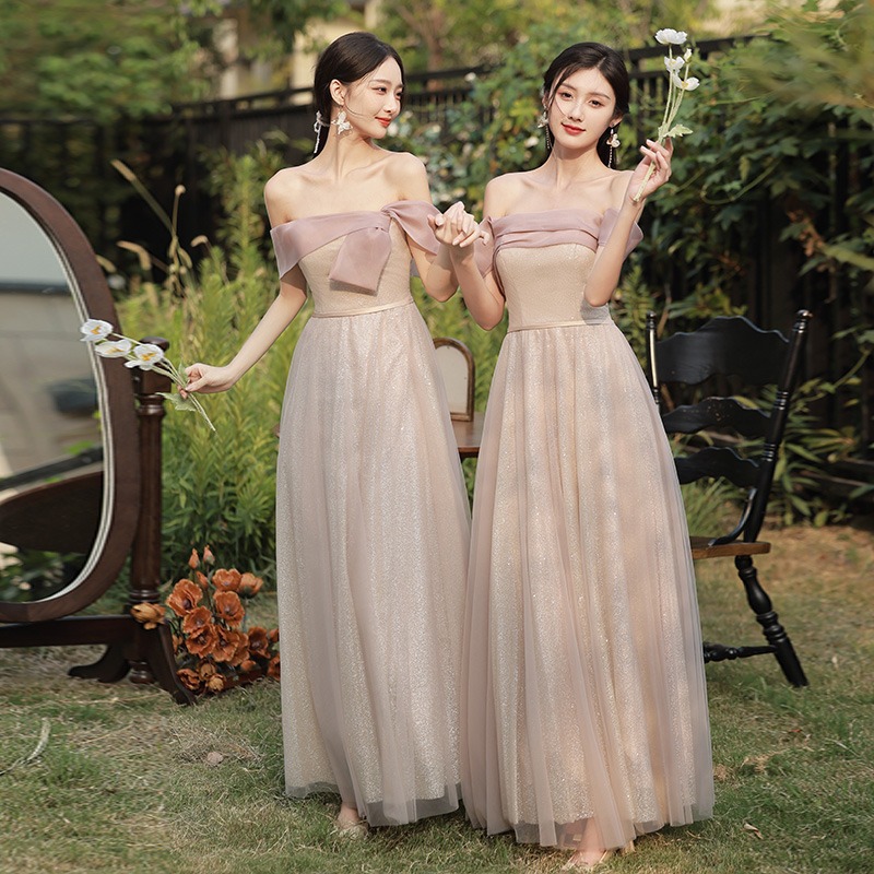 Gaun pengiring pengantin wanita, gaun malam bahu terbuka peri elegan pelangsing kelas atas Musim Panas 2024