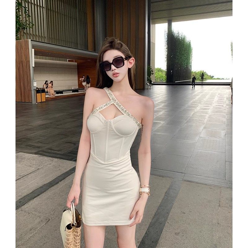 Gaun Suspender Bahu Miring Murni Terlihat Langsing Berkelas Tinggi Kemewahan Ringan Gaun Wanita Rok Membungkus Pinggul Tulang Ikan Mengikat Pinggang Model Baru Musim Panas