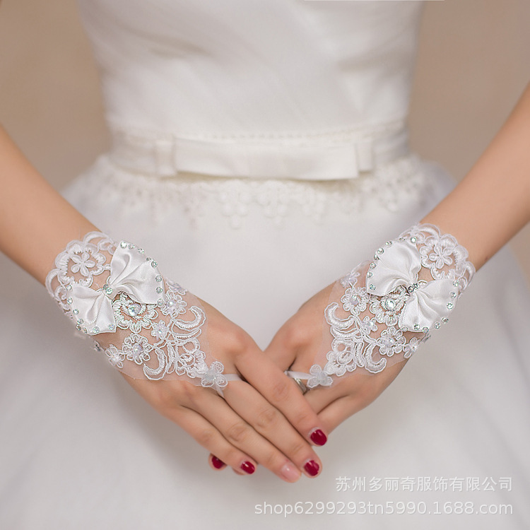 Sarung tangan pernikahan etiket sarung tangan pendek putih busur plus berlian renda tanpa jari indah Aksesori gaun pernikahan