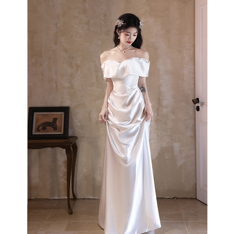 Gaun Pengantin Ringan Warna Putih Satin High-end Minimalis Gaun Malam Sehari-hari Gaun Pengantin Gaun Pakaian Jubah Pagi Elegan Terlihat Langsing Pakaian Bersulang