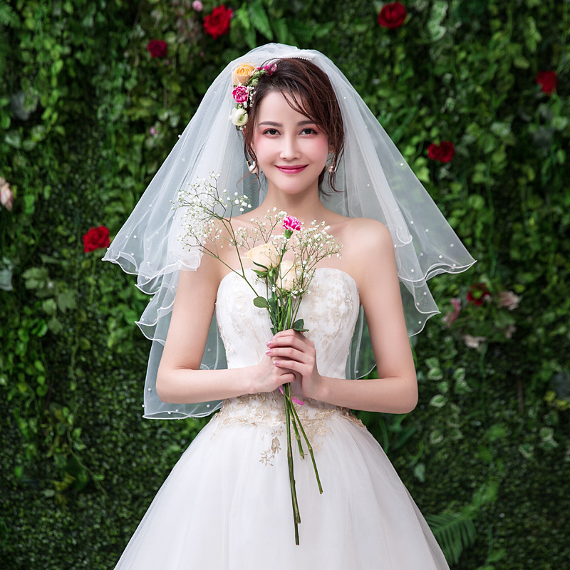 Kerudung pengantin pernikahan lapisan ganda Swiss, jilbab pinggang manik-manik jaring fotografi perjalanan pernikahan indah 9333