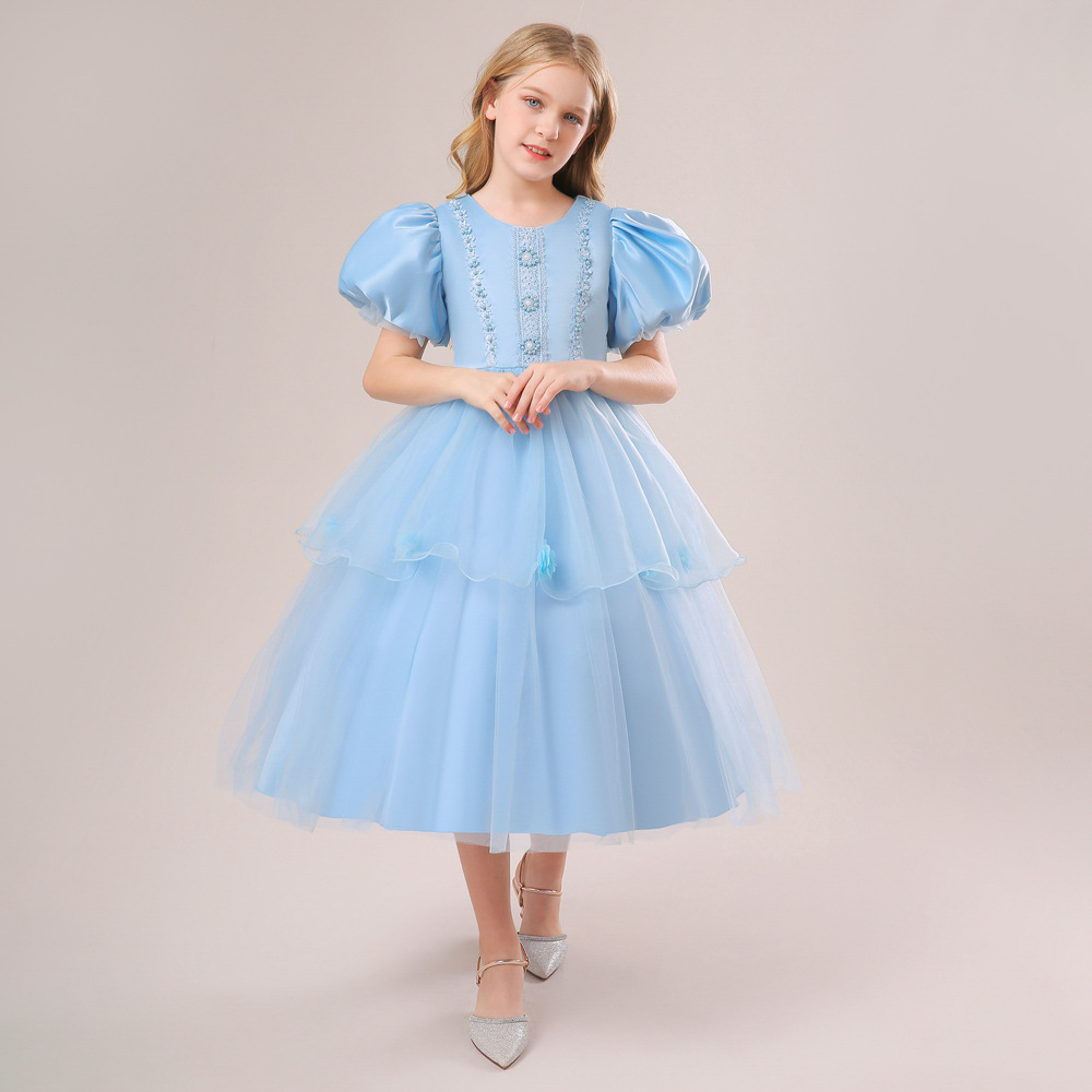 Gaun anak-anak Eropa dan Amerika, benang halus gaun putri anak perempuan bermain piano gaun pernikahan renda anak perempuan bunga kecil