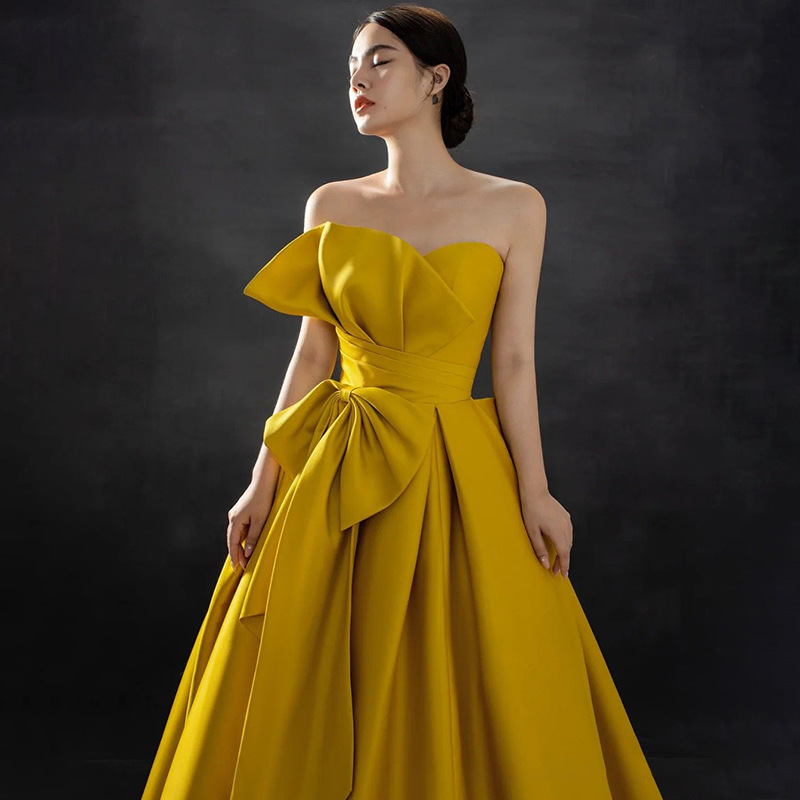 Gaun malam upacara ulang tahun dewasa tabung kuning atas gaun ujian seni vokal tekstur digniche mewah ringan wanita