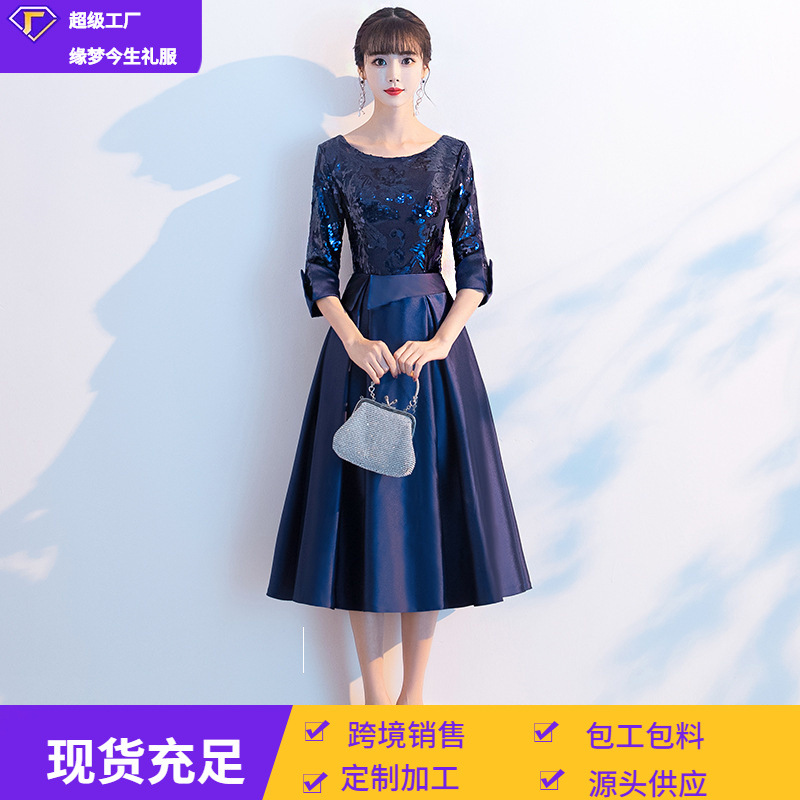 Gaun malam biru wanita elegan untuk ibu, Gaun jamuan makan kelas atas, gaun pernikahan ibu depan pendek dan gaun belakang panjang bisa dipakai di waktu biasa musim panas