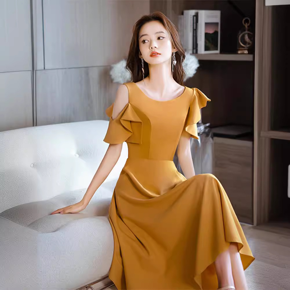 Gaun malam wanita gaya Perancis niche, gaun kuning sosialit ringan bisa dipakai di waktu biasa