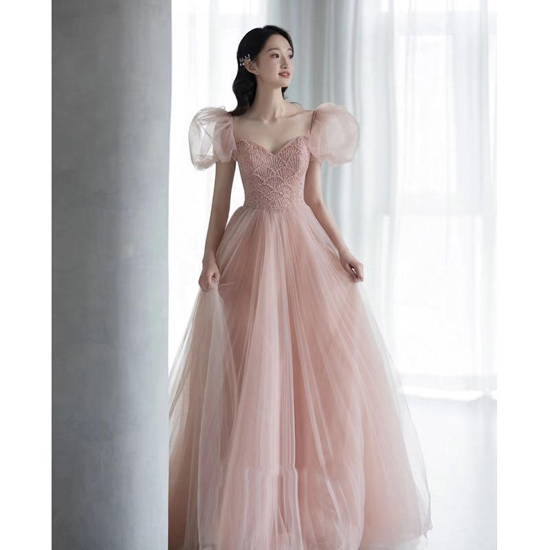 Gaun malam panjang wanita, gaun jamuan makan malam elegan untuk putri gaya Korea ramping Musim Panas 2024