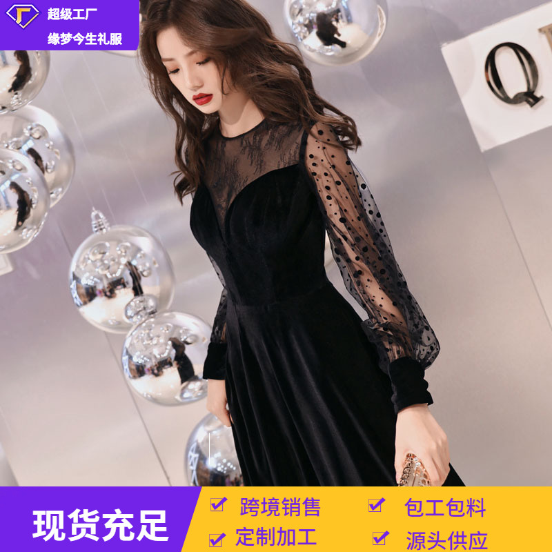 Dress pesta malam wanita, Gaun malam hitam lengan bahu jala temperamen baru 2024