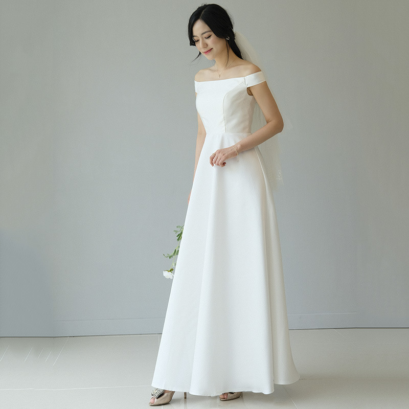 Gaun pernikahan ringan satin baru gaun kecil Mori Wanita Super peri bepergian tembakan pintu benang Hepburn gaya sederhana bahu terbuka