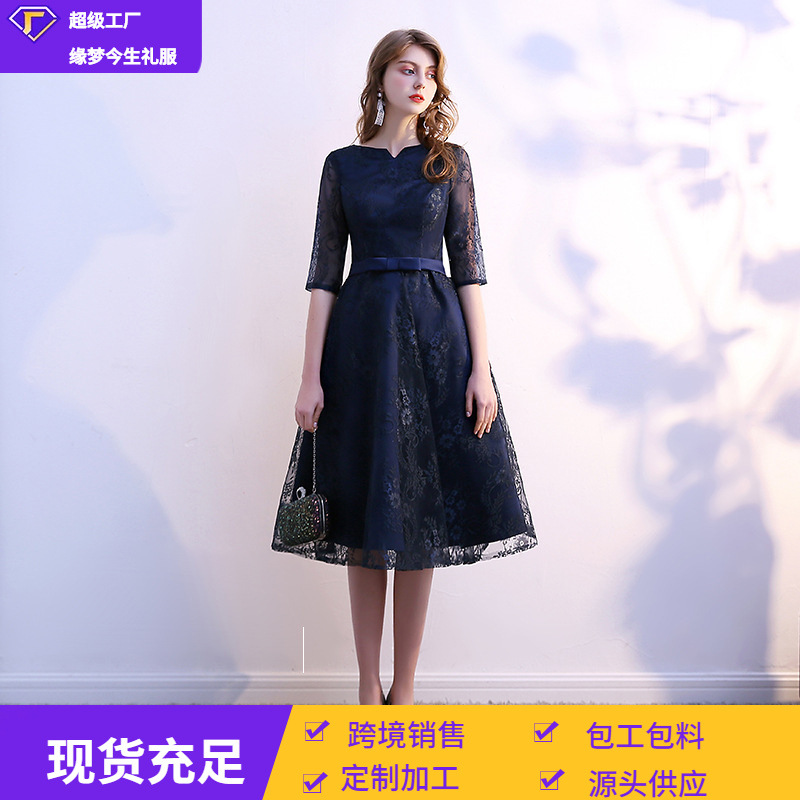 Gaun malam Pertemuan Tahunan wanita elegan setengah panjang 2024 baru AliExpress gaun pesta makan malam biru laut pelangsing