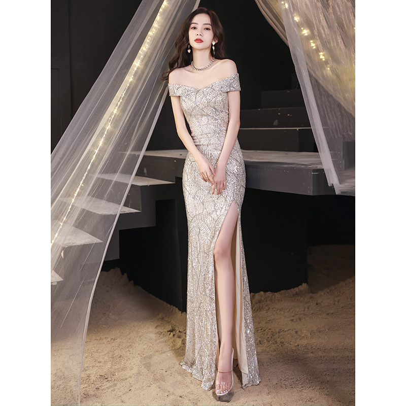Gaun malam perjamuan 2024 gaun ekor ikan berkilau tingkat tinggi wanita baru gaun niche mewah ringan bahu terbuka