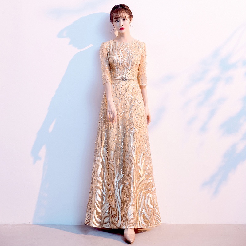 Gaun malam emas untuk wanita, gaun jamuan makan malam elegan tekstur kelas atas, kostum panjang paduan suara untuk wanita